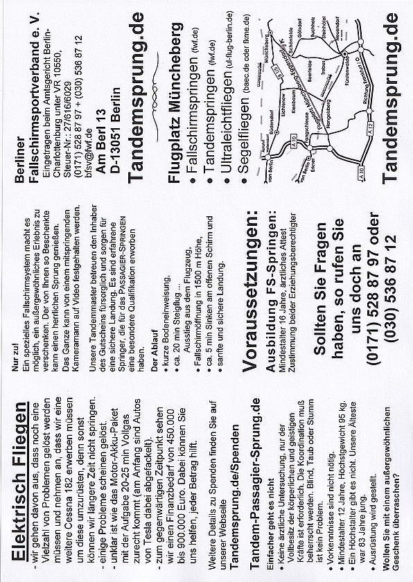 Berliner Fallschirm- sportverband e. V. Tandemspringen und konventionelle Ausbildung im Fallschirmsport im Umland von Berlin am Flugplatz Müncheberg-Eggersdorf im Bundesland Brandenburg. Info-Material download Windows->pdf alles Android->jpg Seite 1 und Seite 2 Vielleicht ahnen Sie etwas von der Schönheit der Entspannung, welche der Anspannung folgt. Preise Spenden Diashow Impressum Datenschutz |
